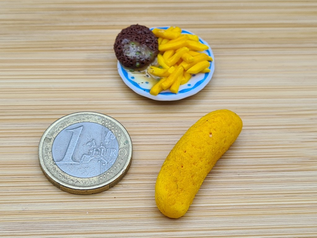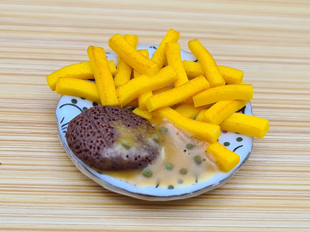 Cette semaine, j’ai réalisé une commande personnalisée et j’ai dans ce but créé un Curly ainsi qu’une assiette de miniature garnie de frites et d’un steak haché accompagné de sa sauce au poivre vert.