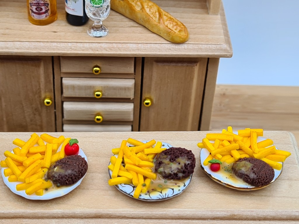 Comme la cliente souhaitais que la sauce au poivre soit très abondante, pour la miniature, j’ai dû recommencé tout à zéro afin de lui proposer un nouveau modèle d’assiette de frites… Pour cela j’ai fait plusieurs essais « de dosage de sauce » avant d’arriver à une assiette qui respecte bien le cahier des charges : steak, frites et (beaucoup) de sauce au poivre vert.