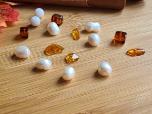 J’ai tout d’abord choisi des perles de culture d’eau douce (j’adore le fait que chacune d’elles soit unique !), des perles d’agate blanche et surtout diverses perles d’ambre de la baltique.