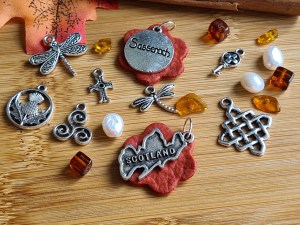 En ce qui concerne les breloques, j’en avais beaucoup qui pouvaient se marier avec mon thème (nœud celtique, chardon d’Écosse, libellule de forme diverses…) et je les ai complétées par des perles plates que j’ai fabriqué en pâte polymère. Pour mes perles plates, j’ai opté pour des tons chauds (rouille, marron) qui s’associent bien à l’automne et surtout à l’ambre dont je prévois de décorer mes bracelets et je les ai texturé pour obtenir un effet cuir grainé.