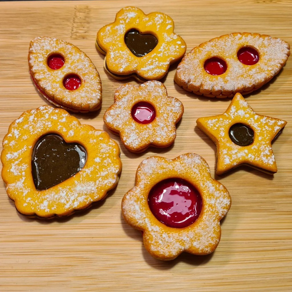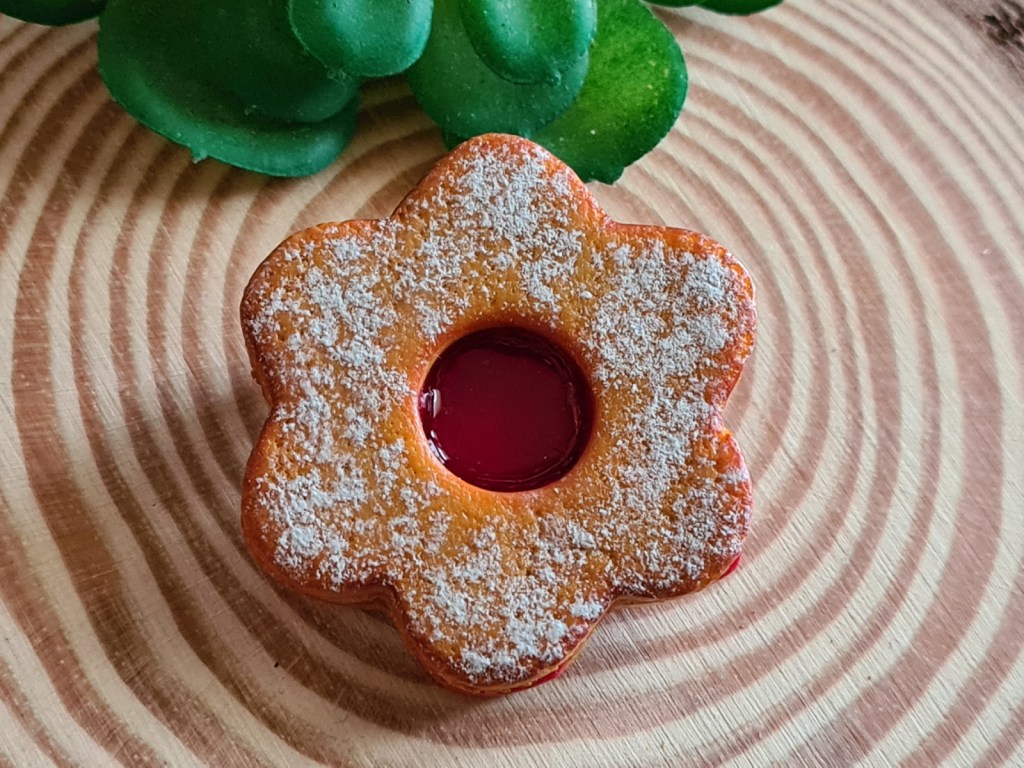 Ensuite, un grand classique qui me rappelle mon enfance le biscuit sablé avec ses deux trous qui laisse apparaître la confiture de fraise ou framboise. Je pense que nous l’avons tous apprécié.