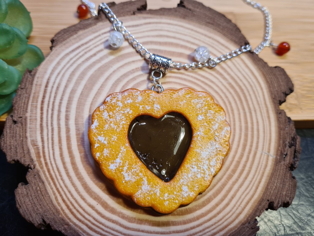 Tout d’abord dans la famille des colliers, un large pendentif cœur en biscuit sablé au chocolat de taille réelle. Il est monté sur une longue chaine ajustable en acier décorée de perles de verre et de perles d’agate rouge.