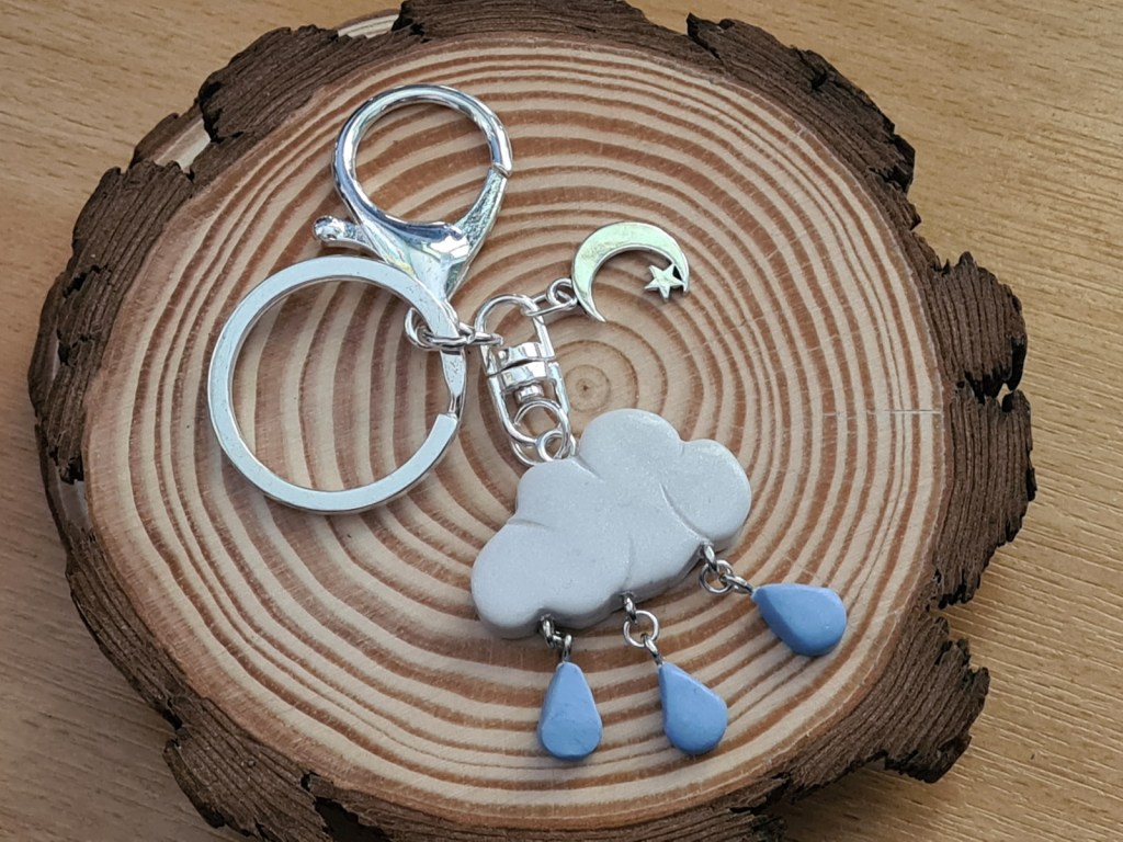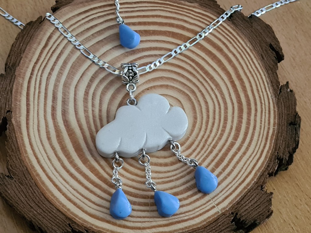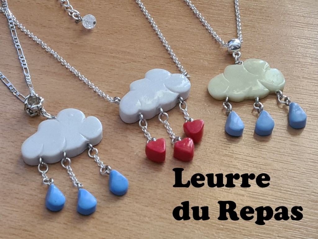 J’ai réalisé des colliers à breloques « nuages de pluie ». Les petits nuages sont blancs nacrés, gris ou phosphorescents. Ils sont accompagnées de breloques « goutes d’eau ».