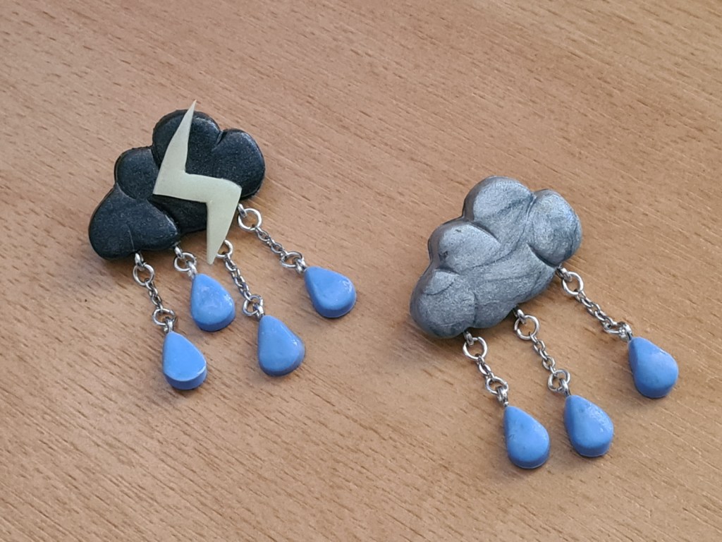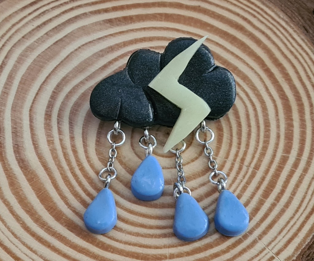 Pour la broche « nuage d’orage » l’éclair est phosphorescent et il brille dans le noir.