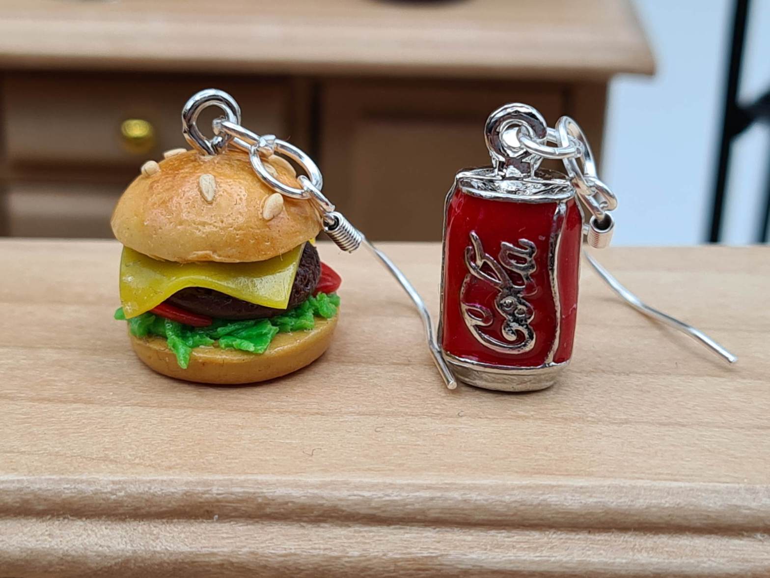 Boucles d’oreilles en pâte polymère en forme de hamburger miniatures.